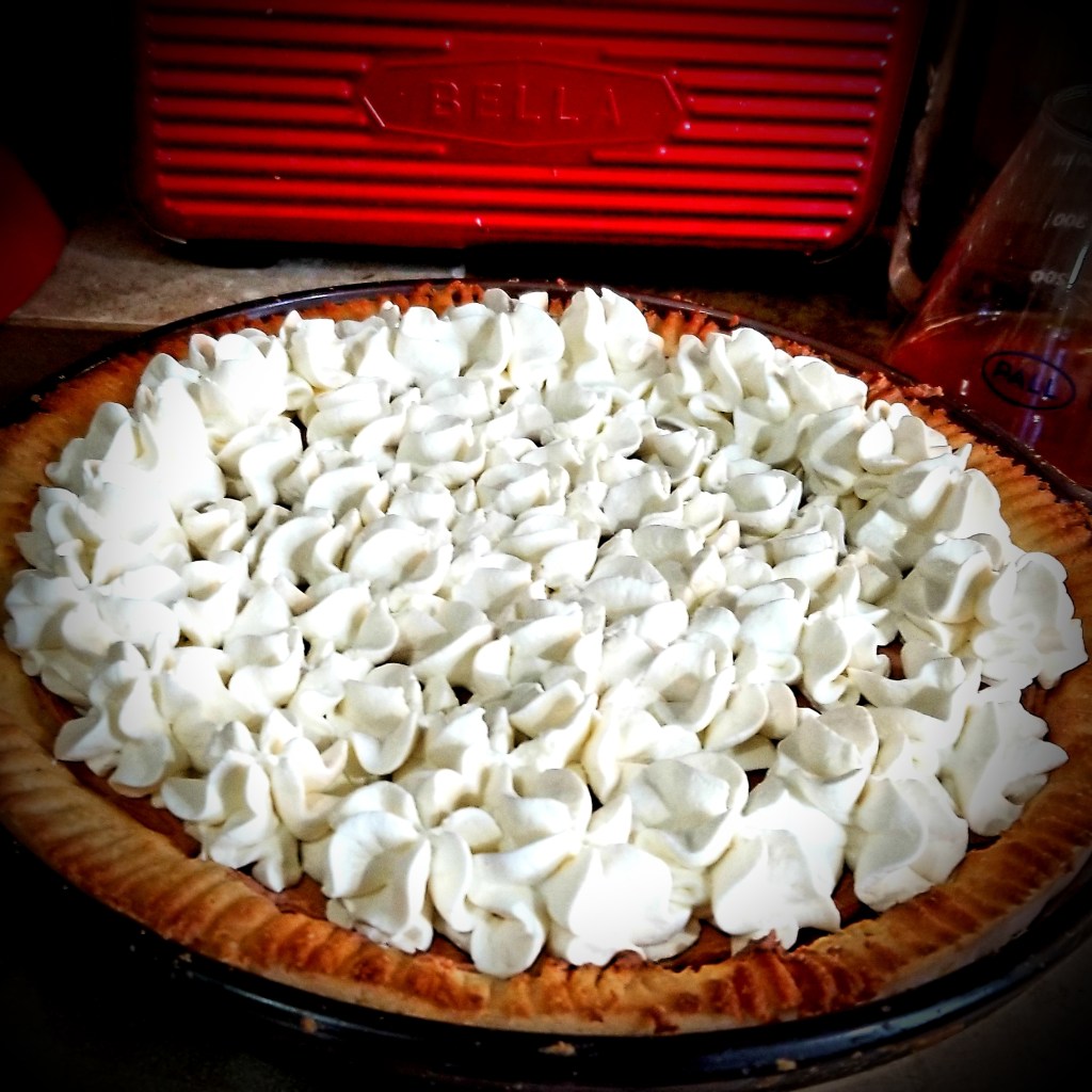 - Spread or pipe your topping onto your pie and chill in fridge. (This whipped cream should hold its shape well when piped, and will resist melting at room temp.)