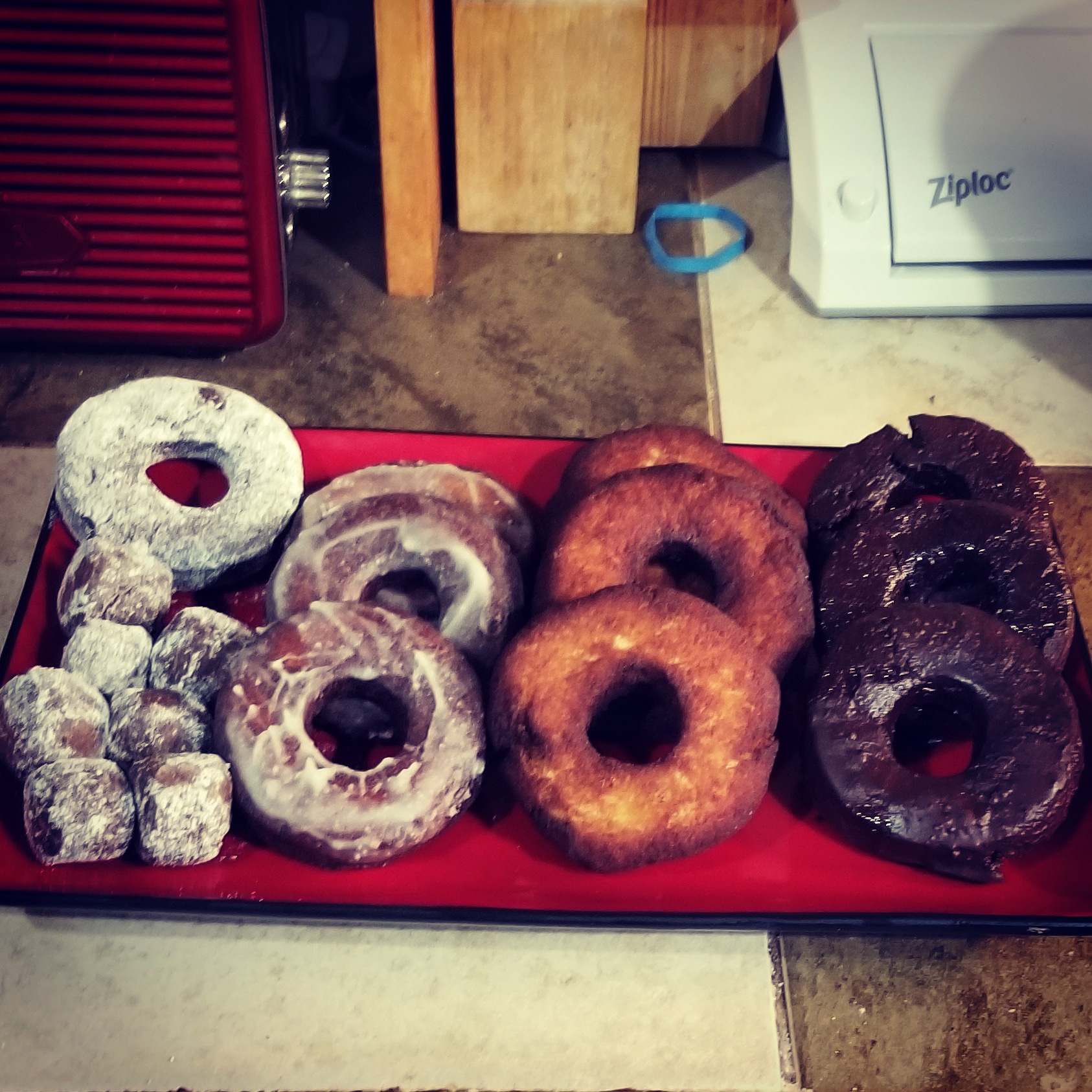 The frying oil makes a big difference. If frying in an oil that is soft or liquid at room temp, then your donuts are likely to be more oily at room temp (and have a different flavor, similar to funnel cake). If you use a very hard oil, like crisco all vegetable shortening, then your donuts will have a hard and crispy exterior. Blending different kinds of oil is okay, and can be the trick to getting just the right consistency. There is a whole school of thought on what oils to fry donuts in, and I haven’t had the time (or finances) to test them all. Safflower, and peanut oils are two frying oils that have very good reviews for making standard donuts that I have not yet tried with these nut-flour donuts. I’ve tried canola, which makes an oily donut that only tastes right when chilled, and shortening, which makes a crispy donut that tastes delicious as soon as it is cool enough to eat.