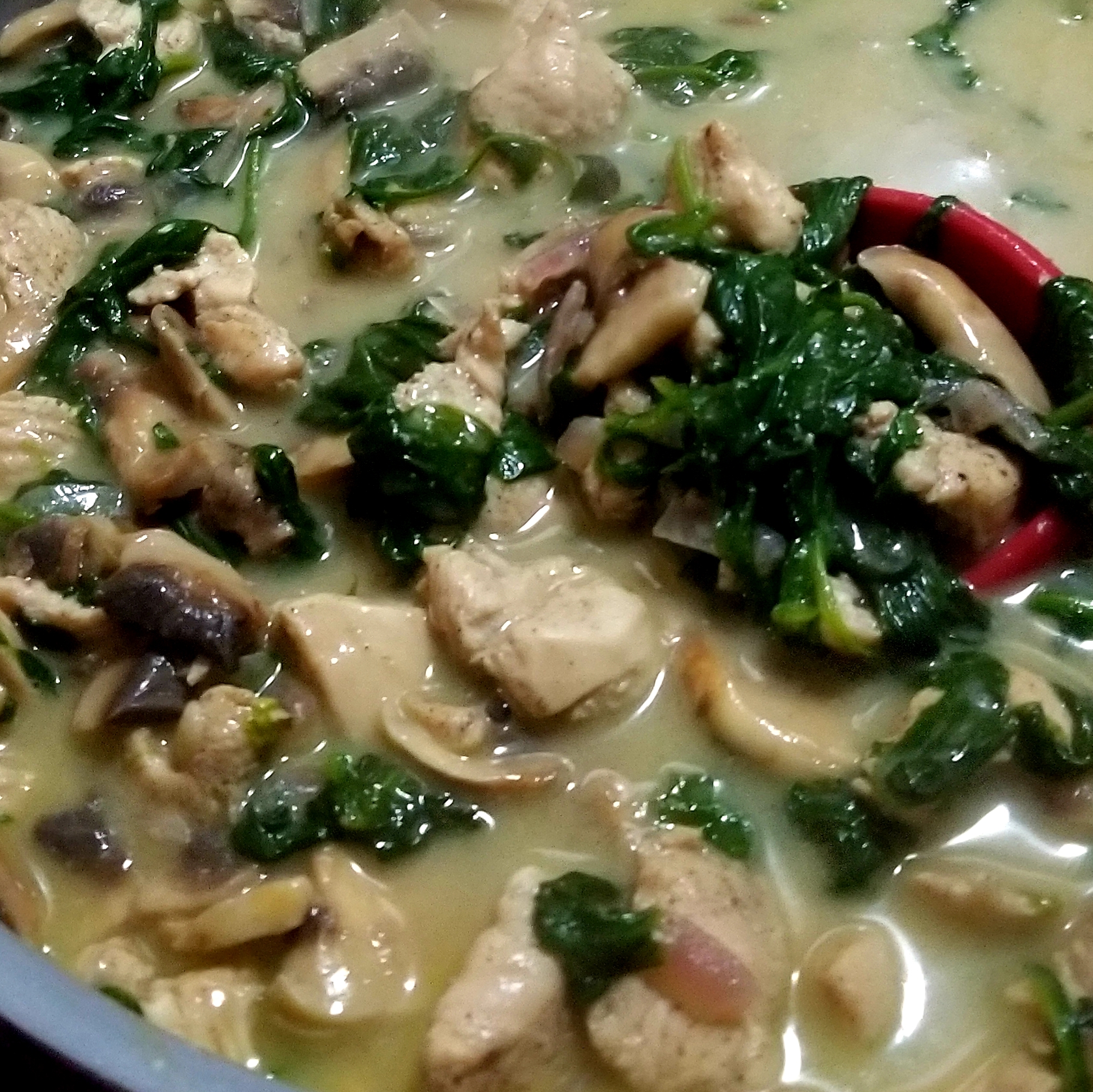 - Combine mushrooms/spinach with chicken in one large frying pan and add in the Coconut Cream.