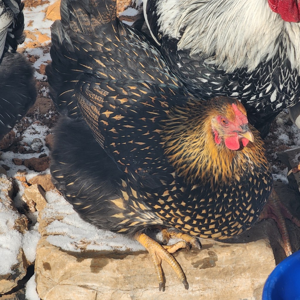 Kahlúa, pictured here (with Dommie’s butt) pretending to be a demon dinosaur, is actually the friendliest of the 3 littles that we hatched here at our homestead. She is a cross of Frederick and Ember.